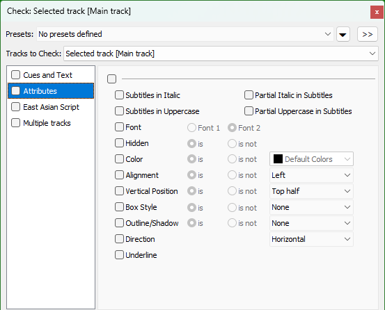 << Click to Display Table of Contents >> Navigation: Quality Control > Check Subtitles > Attributes category |