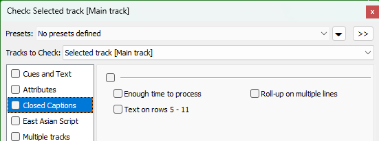 << Click to Display Table of Contents >> Navigation: Quality Control > Check Subtitles > Closed Captions category |