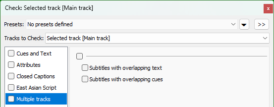 << Click to Display Table of Contents >> Navigation: Quality Control > Check Subtitles > Multiple Tracks category |