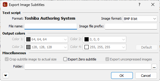 << Click to Display Table of Contents >> Navigation: Export Subtitles > Image Export Formats > Toshiba Authoring System |