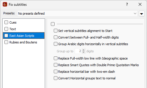 << Click to Display Table of Contents >> Navigation: Quality Control > Fix Subtitles > East Asian Scripts category |