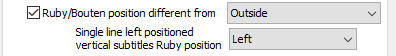 This option automatically changes ruby or bouten positions in one-line vertical subtitle aligned to the left to be displayed Left or Right from the base text. The option can be used only if Ruby/Bouten position different from is set to Outside. The common practice is ruby/bouten characters to be displayed on the right side of the text in one-line vertical subtitles. But there might be a requirement to display ruby in one-line left positioned vertical subtitles to the left of the base text: |