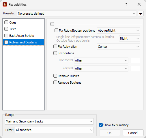 << Click to Display Table of Contents >> Navigation: Quality Control > Fix Subtitles > Rubies and Bouten category |