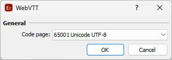 To load WebVTT file in EZConvert you need to choose the file's code page only although, by specifications, WebVTT shall be delivered as Unicode UTF-8 encoded files: