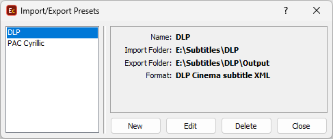 The Import/Export presets can be configured using the Edit/Import & Export Presets menu. The following dialog pops-up: