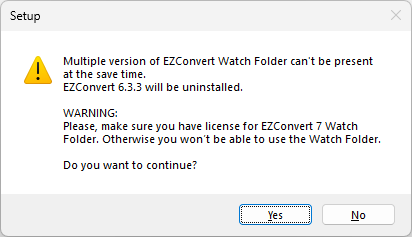 EZConvert7 Watch Folder cannot be used on a computer with running EZConvert6 Watch Folder. If this is the case, the installer will offer you to uninstall EZConvert6 automatically: