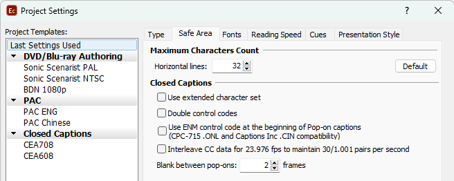 << Click to Display Table of Contents >> Navigation: Configuring Project Settings > Project Settings > Safe Area > Teletext and Closed Captions settings |