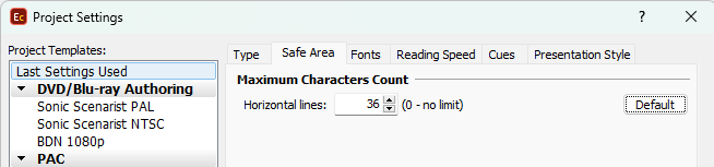 Safe Area settings for Teletext and Closed Captions projects follow similar characteristics - the safe area is defined by the number of characters that can be displayed on any text line. Closed Captions projects provide several options which will be noted later on in this topic.