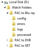 On the above example "D:\Watch Folders\PAC to Blu-ray" is the root folder. By default this is the input folder. The Watch process monitors it and when a new file arrives it is automatically converted.