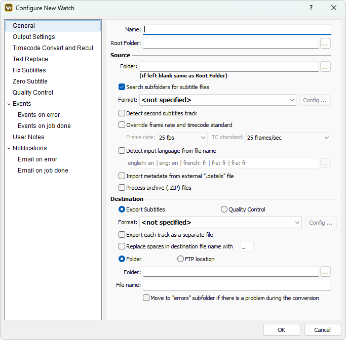 The input file format. First press the Select... button and a list with all supported file formats will be displayed, similar to the Import Subtitles one. Once the particular subtitle format is selected and you press the OK button additional configuration dialog will pop-up with the Import configuration options available for this format. If you are editing an already existing Watch Folder, pressing the Config button will display these options again. |