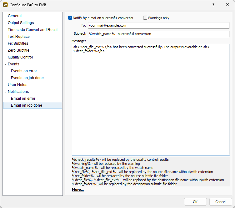 Warnings only - this option is available only for the E-mail on job done event and will send e-mail notification only when there were warnings during conversion. Notifications will not be send when the conversion goes without any issues.