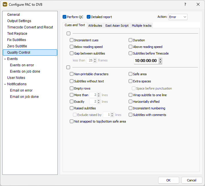You can perform various checks to the subtitles before exporting them or you can configure a quality control job only. The available Checks criteria are divided into separate categories for easier navigation and clean preview of the selected options.