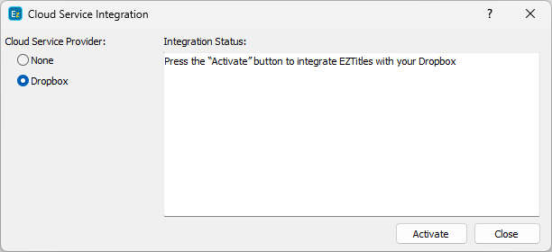 After that from the Edit/Cloud Services menu you can proceed forward and integrate EZTitles with DropBox by pressing the Activate button.