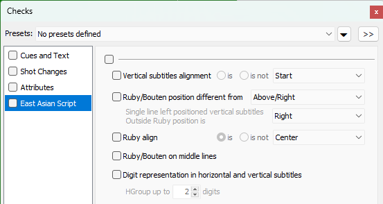 << Click to Display Table of Contents >> Navigation: Quality Control > Check Subtitles > East Asian Scripts category |