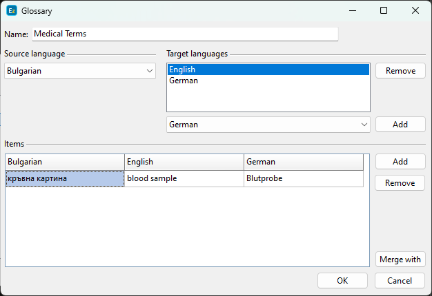 Start by assigning a unique name to the glossary and selecting the source (original) and target languages. If needed, click More Languages to add additional target languages. This is equivalent to creating separate glossaries for the source language and each target language. For example, if Bulgarian is the source language and the target languages are German and English, the glossary can be used for translations from Bulgarian to German and Bulgarian to English. To remove a target language completely, select the language and click Remove.