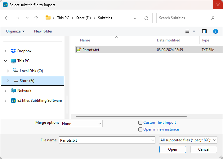 button on toolbars. After that the regular for Windows open dialog will appear allowing your to browse through all files and folders on your computer. At the end select the file you need to import in and if EZTitles recognizes its format, or in other words if it is in format which we support, the file will automatically load up.