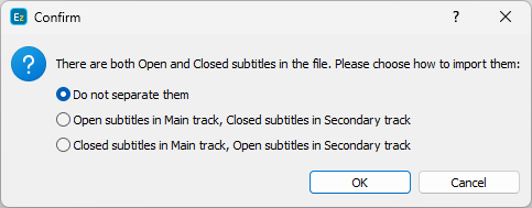 All subtitles indicated as "closed" in the input file will be loaded in the main subtitle track while all subtitles indicated as "open" in the secondary subtitle track. |