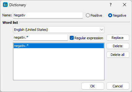 The first thing to consider is the name for the new dictionary and specify if the words in it would have Positive or Negative meaning.