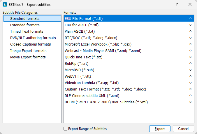 The loaded in the project reference file can easily be saved or exported to any of the supported by EZTitles file formats. To do so browse the File/Reference File menu and use the Save/Export Reference file option there. After that the regular Export Subtitles dialog box will appear to select the output subtitle format.