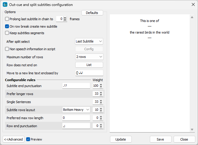The Preview checkbox opens the preview panel (the right part of the above image) showing how the text in the current chain would look like after executing the command with the current configuration. Modifying the rules or changing their weight to the algorithm will not simultaneously update text's preview. It will be updated only after pressing the Update button.