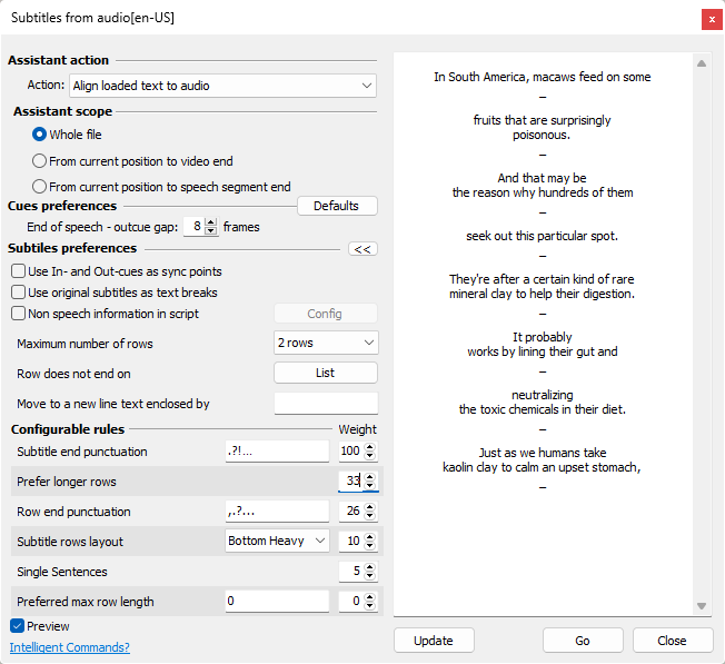 The Preview checkbox opens the preview panel (the right part of the above image) showing how the text would look like after starting the Assistant with the current configuration. Modifying the rules or changing their weight will not simultaneously update text's preview. It will be updated only after pressing the Update button.