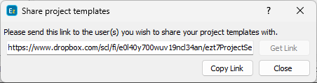 You need to press the Get Link button in order to generate a link for accessing the templates directly from the cloud. The Copy Link button could be extremely useful, since you need to copy the generated link and send it by e-mail or any instant messaging application to the person who need to get access to your shared templates.