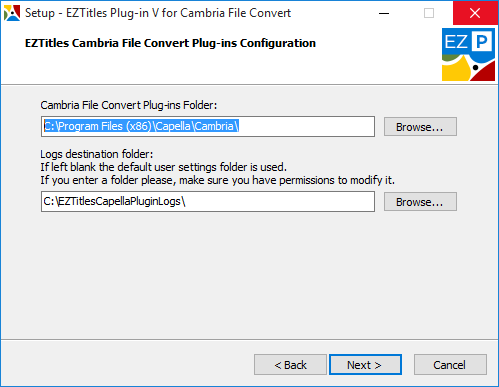 The EZTitles Plug-in adds warning and error logging features and the next step will be to select the error/warning log's folder. There are two types of log files - the one intended to keep all the warnings and the second for the errors detected. The installer automatically selects the C:\EZTitlesCapellaPluginLogs folder and sets such access permissions for it that any user can modify its contents . If you choose to select different, previously created folder you may also need to modify the access permissions for it accordingly.